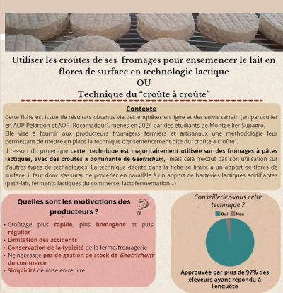 Sur la base d’une enquête en ligne et de suivis terrains menés en 2024 par des étudiants de Montpellier SupAgro, le RMT Fromages de Terroirs publie la Fiche « Utiliser les croûtes de fromages pour ensemencer le lait en flore de surface en technologie lactique ».