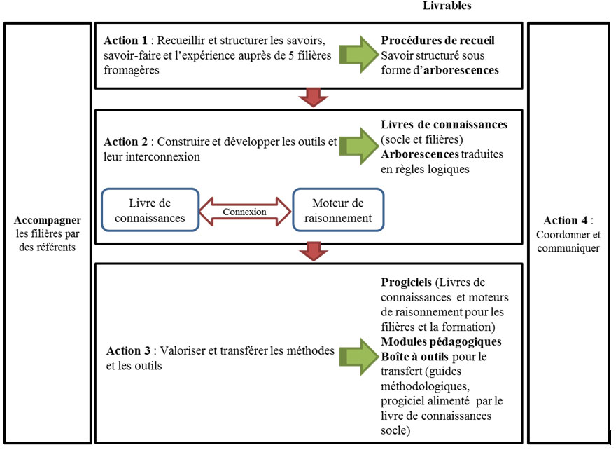 Son objectif est de faire la preuve qu’il est possible de capitaliser, à l’échelle d’une filière, l’expérience fromagère des praticiens (fromagers) ainsi que l’expérience technique et les connaissances scientifiques (fromagers, techniciens fromagers et chercheurs), par des méthodologies de recueil et de structuration spécifiques. La mise au point d’un progiciel1 d’aide à la décision associant deux types d’outils numériques de gestion des connaissances constitue l’objectif central de ce projet.